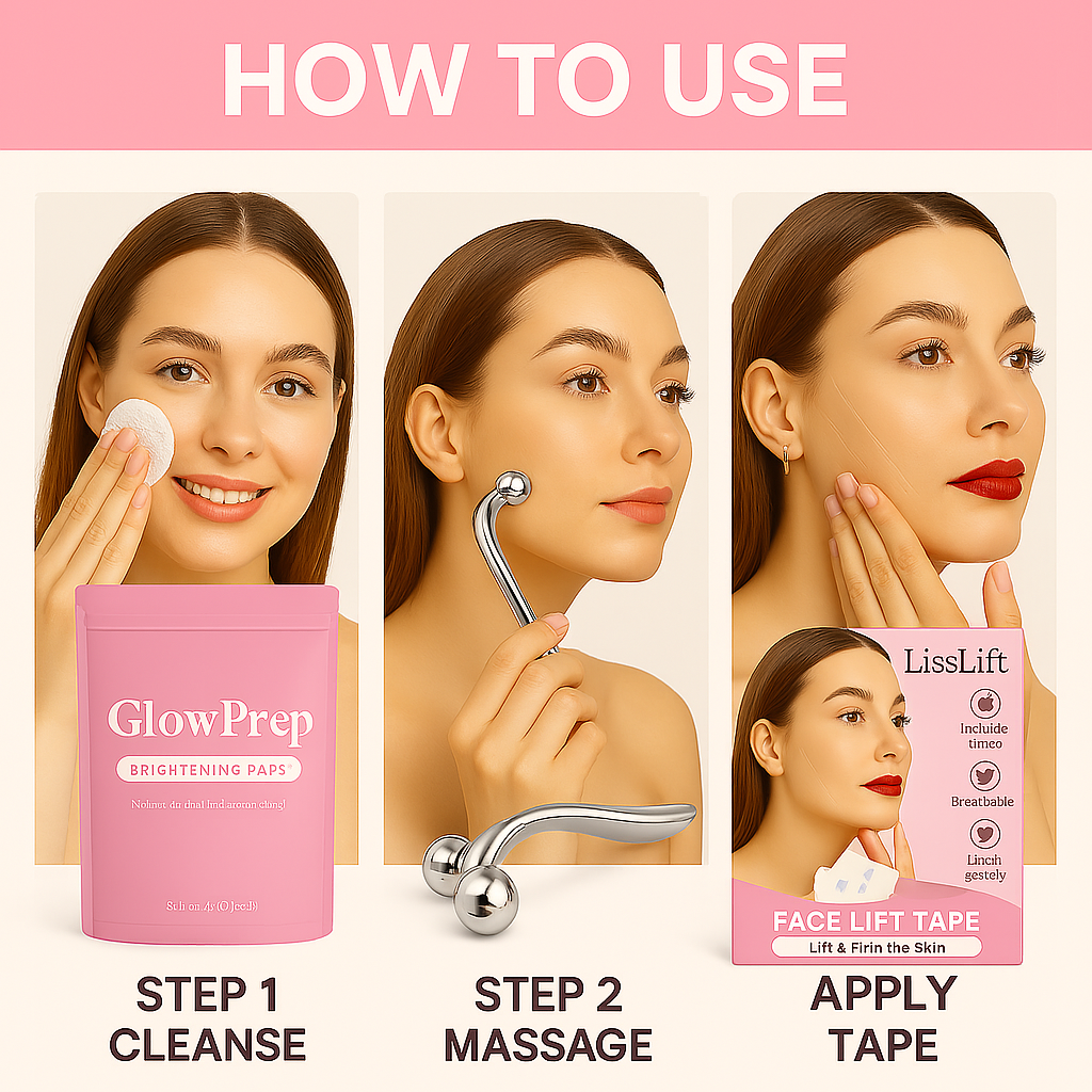 Mit GlowPrep reinigen, mit dem Facelift Roller massieren, Tape auftragen und fixieren. Zum Schluss Make-up oder Frisur auftragen – und strahlen!